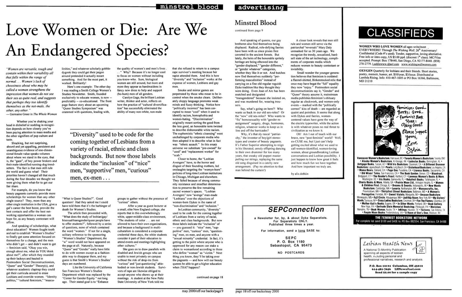See Alix Dobkin, “Love Women or Die: Are We an Endangered Species?” off our backs, vol. 30, no. 5 (May 2000), 9, 18.